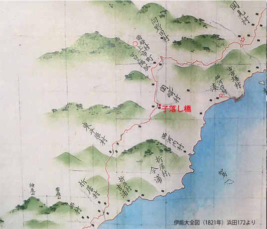 「子落し」は古来、浜田から益田、萩へ向かう山陰道が折居でいったん山側に入り、再び三隅川の下流に沿って日本海側に出る道と、そこで左にとって山を削られた道をまわり、上流に沿って城山下の町中から田畑を抜け益田へ至る旅の人なら 誰でも通る小さな谷間になっています。彼女が左手の山を削られた道をまわって 三隅川を上流にとれば、その頃でも 小野村神本(かもと)という小さな村落はあったでしょう。土橋を渡って細田、三保にかけては見通しがきくものの所々田畑があるだけの湿地帯で田ノ浦海岸に出て、はるか川向こうに見えかくれする古市まで人家は無かったことでしょう。橋の袂に置かれた赤ん坊はそのあとすぐ神本の里人に拾われました。