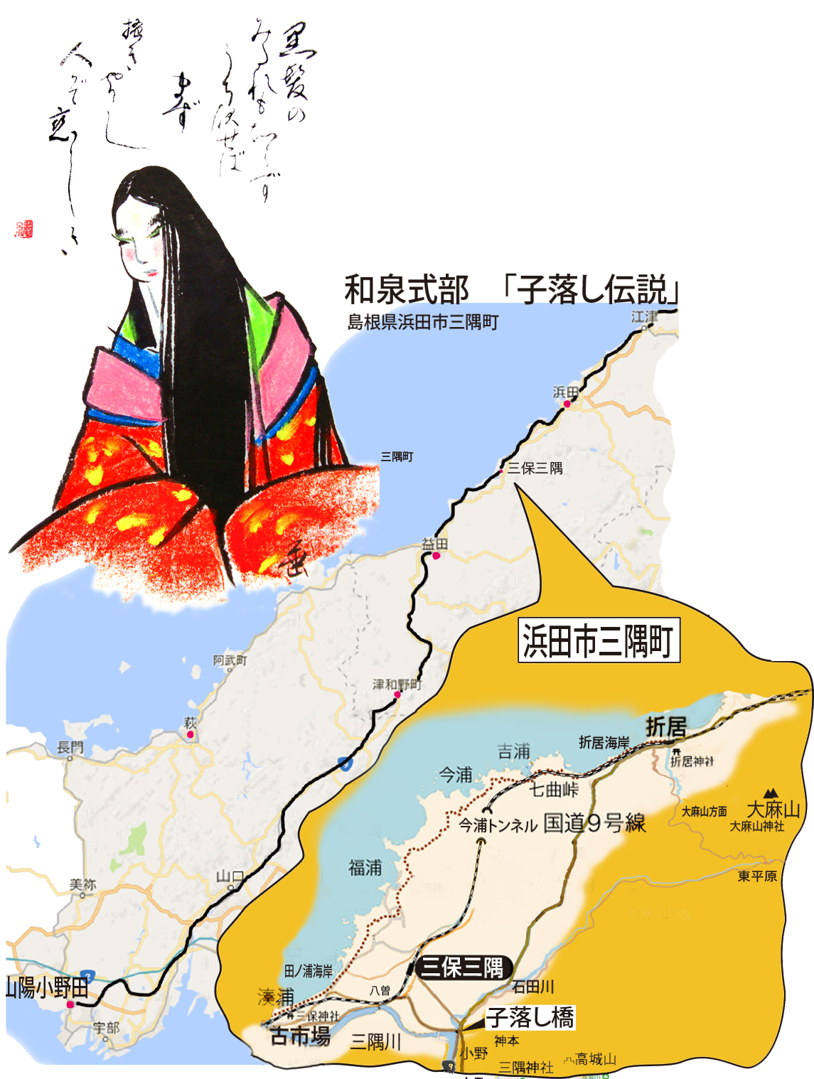 子供は地元の人に乳をもらい、式部にも命があって再び母子が逢えたことは奇跡中の奇跡。三隅川は鮎の産地、「うるか」は母乳を促す。そこは「命拾い橋」「子育て村」、小野村神本(かもと)の人の理解を得て式部母子が手を取り合って大麻山から三階山(みはしやま)のふもとの里道を喜び勇んで京へ向う姿が目に浮かぶ。母子の往復した「絆の道」は後に彼女に多くの秀歌を生む原動力ともなった。今は国道となって三隅神社参道メインロードに直結、「子落し」とは大きな宝物が産みおとされたものだ。